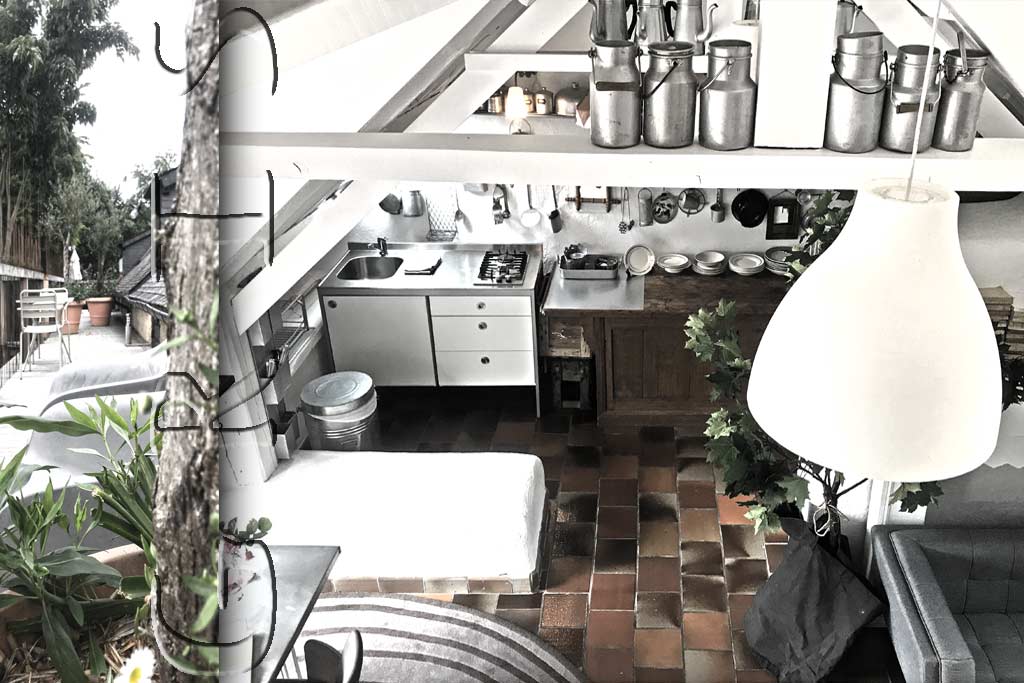 A converted attic setting on an old family farm, this bedroom will welcome you for an authentic stay in Brittany. The careful mixture of grey tones and wood, will procure a delightful feeling of relaxation and warmth... The theme of the interior decor is chic bric-a-brac. Are you looking for some privacy ? Take the small staircase that leads to the cozy bedrooms. Meet up for the evening aperitif ? Go to the terrace overlooking the valley.